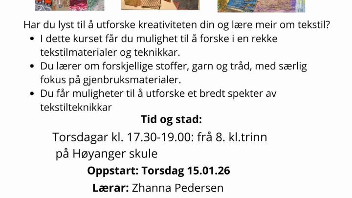 Kulturskulen startar opp visuelle kunstfag for deg som går i 8.kl.trinn og oppover. Eitt spannande kurs innan tekstil der ein nyttar ulike teknikkar. Vi startar opp torsdag 15.01.26 kl. 17.30-19.00 på Høyanger skule - kom og prøv to gongar gratis.