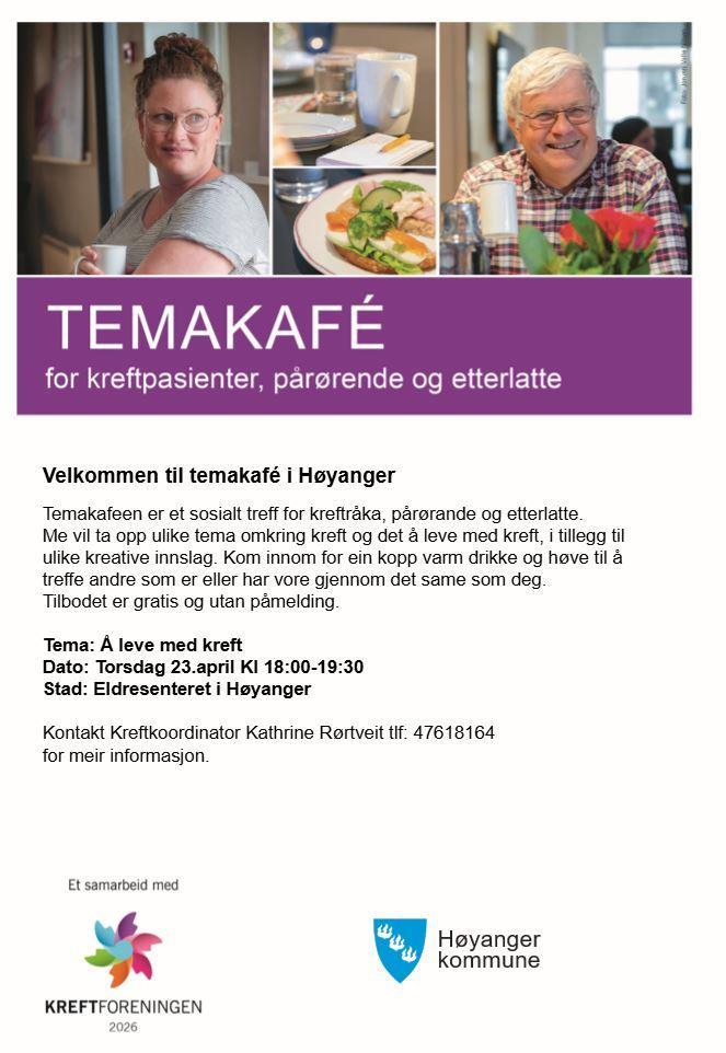 Plakat "Temakafê for kreftpasientar, pårørande og etterlatte"Temakafeen er et sosialt treff for kreftråka, pårørande og etterlatte.